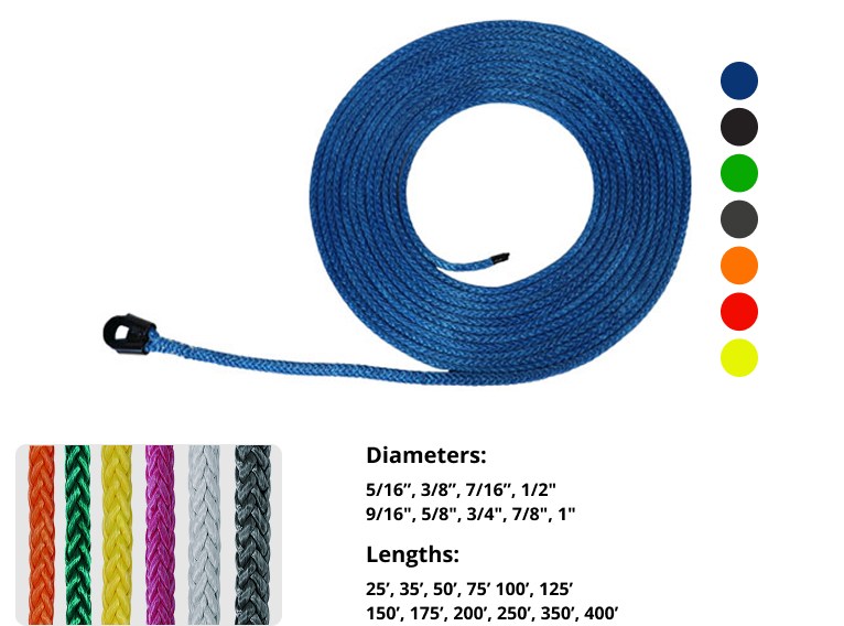 Lengths can range from 25 feet up to 400 feet, and sizes vary between 5/16-inch and 7/8-inch. The working load limit depends on both length and diameter, so always confirm capacity before making a purchase.