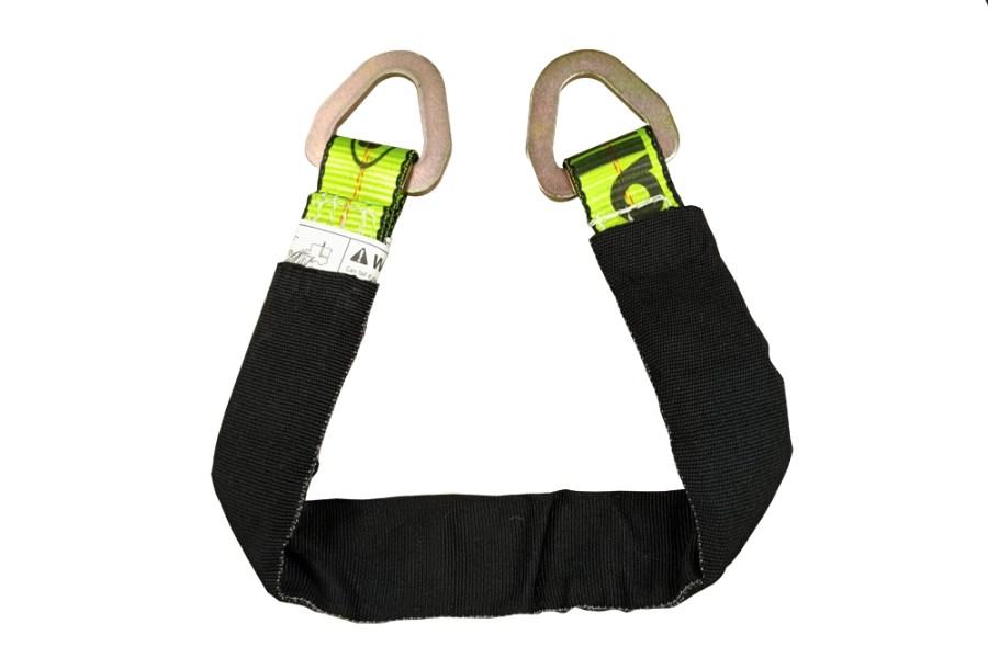 These All-Grip Axle Straps are similar to the standard All-Grip Axle Strap in the same way that they are both made of two ply 2" wide Pro-Edge material. However, these straps have an extra benefit to them, these straps have a heavy Cordura tubular sleeve that can slide up and down on the strap to provide extra protection against abrasion. These straps have a work load limit of 7,000 lbs in a basket hitch. These are the 30" long straps with a 24" Cordura sleeve and only weighs 1.6 lbs. These straps are also made in the USA.