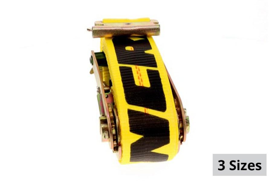 yellow ratchet strap with spring E fittings keeps the tougher cargo firmly in