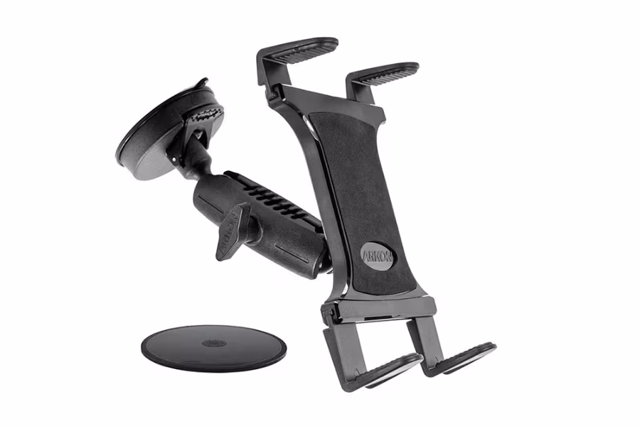 The Windshield Suction Slim-Grip® Tablet Mount is highly adjustable. Its double rubber ball adjustments allow the mount to be moved into a variety of positions that give you better access to your tablet. It mounts with a suction base so you can place it where it’s most convenient for you. Finally, with its different support legs, you can fit tablets that are up to 18.4” large.