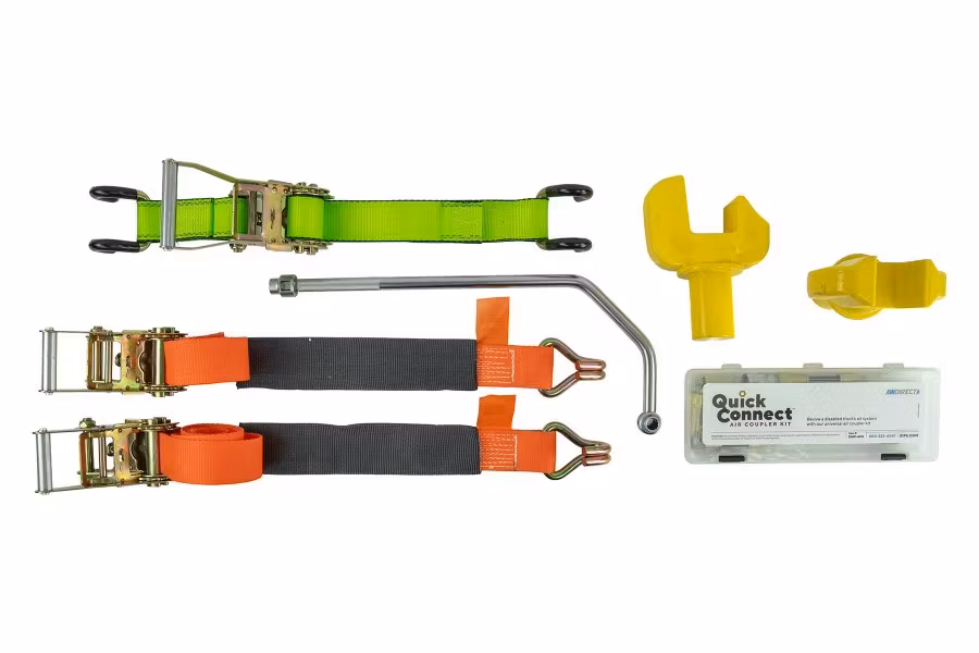 Don t leave the shop without this heavy-duty front tow Starter kit from AW Direct. This entry-level package includes a Quick Connect air coupler kit to supply air to brake and suspension components on the disabled truck. The included Miller short tapered axle fork set eliminates double picks by providing just enough axle clearance on the leading edge. This essential kit also includes a pair of medium-duty tie-down straps to secure the front axle to the underlift and a cam-style steering wheel lock to prevent the front wheels from shifting while under tow. See below for kit components and individual part numbers.