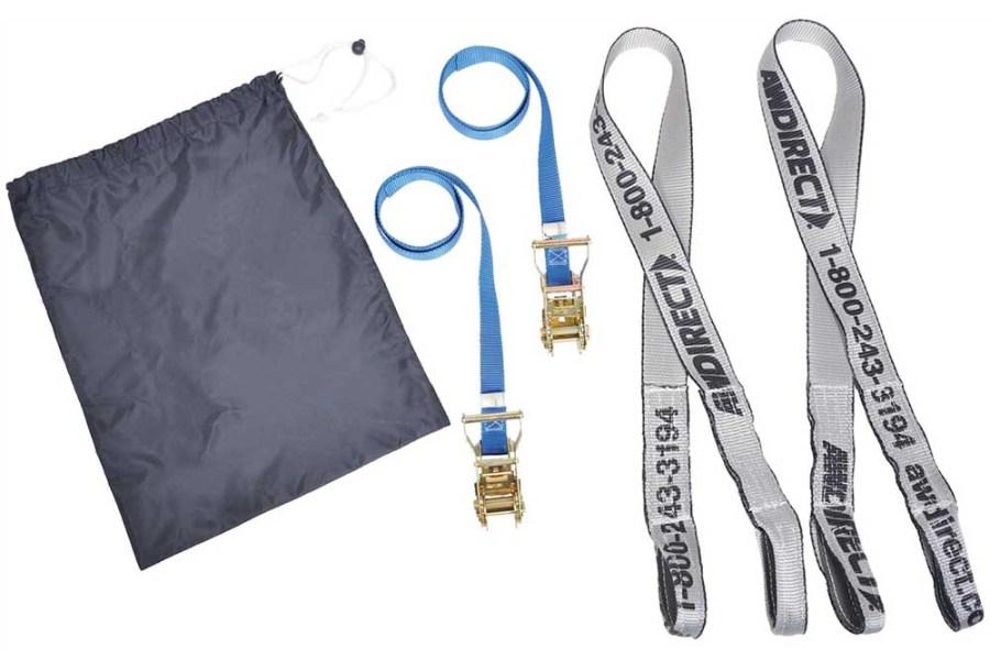 Rely on this 56" Motorcycle Tie-Down Kit from AW Direct to avoid damage associated with conventional chain slings. The reflective AW straps have sewn in eye loops on each end and are PVB coated to withstand the elements. Use these straps to lift the motorcycle from the front forks and rear wheel and then use the blue ratchet straps to secure the bike to your wheel lift.