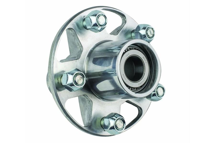 This is a complete aluminum hub assembly for a Collins Dolly by Collins Manufacturing. This is a 5-lug hub that is made in the USA. This kit includes all races, bearings, spindle nut, washer, cotter pin, grease seal, bolts and dust cover that you will need to complete your hub assembly.