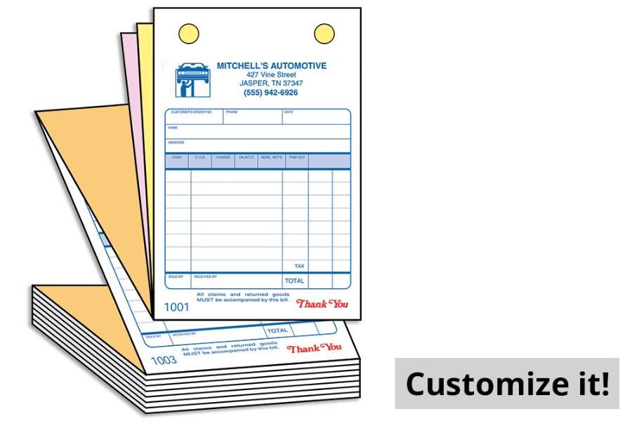 These Register Forms can be imprinted with your company's name and address, up to 6 lines of type. The 3-part carbonless form is perfect for sales slips, work orders or receipts. These ticket book are available in 2 sizes. The smaller size dimensions are 4" x 6", and the large ticket book dimensions are 5.5" x 8.5". Please select from the Dropdown above.