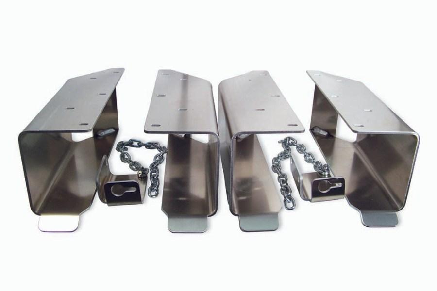 These Pro Series Dolly Bunks from In The Ditch fit all sizes and all brands of dollies with either 4.80 x 8 or 5.70 x 8 tires. Dolly bunks are made from 3/16" thick aluminum and will last for years. This set includes two complete bunks and two lockable retaining chains.