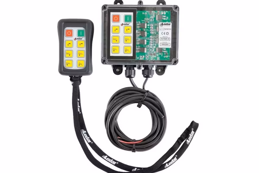 This Wireless Remote System allows you to control your equipment from a safe distance. Water-resistant receivers can be wired simultaneously with other existing hand controls that use their own signal. Systems that feature a key on the receiver can be controlled even when remote is damaged or lost. All systems include an Emergency Stop Button for added safety. 12/24V DC.