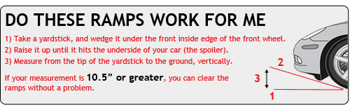 Easily maintain, service or display your sports car with our 40-inch Sport Ramps. We engineered these ramps to work with lowered and short-nose vehicles such as stock Miatas, Subarus, Evos, BMWs, Triumphs MGs, Jaguars, C1-C3 Corvettes and more. This set of two ramps fits tires up to 8 inches wide, and provides a full 7 inches of lift. They have a 16.7-degree angle of approach and can hold up to 1,500 pounds each for a total vehicle weight capacity of 6,000 pounds, yet each ramp only weighs 6 pounds. The raised lip alerts the driver that they ve reached the top of the ramps