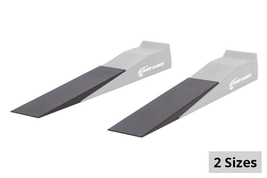 These 14" Xtender Ramp extensions are designed to work with our 67-inch Race Ramps, and they reduce the angle of approach to 6.6 degrees for low profile cars. These 12" Xtender Ramp extensions are designed to work with our 56-inch Race Ramps, and they reduce the angle of approach to 6.6 degrees for low profile cars.They are a handy resource for garages and auto shops that work with multiple makes and models, or for the home enthusiast who might just need a slightly gentler incline to accommodate a new car, or a modded car with a lip or splitter. The 14" can accommodate tires up to 12 inches and only weigh 10 pounds apiece. The 12" can accommodate tires up to 10 inches, and only weigh 10 pounds apiece. Once your car is parked at the top of your ramps, the extensions can be removed for additional work space - just remember to put them back before you drive down!