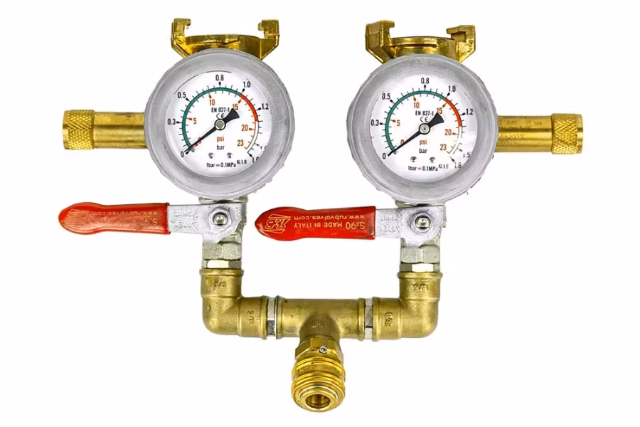 Control two Vega 12 lifting bags from one air source with this Double Deadman Handheld Controller from Sava. The comfort-grip handle allows for one-handed operation with color-coded air supply controls for your thumb or forefinger. The controller features two air gauges, two front side release valves and protective bars on each side in case the controll is dropped.