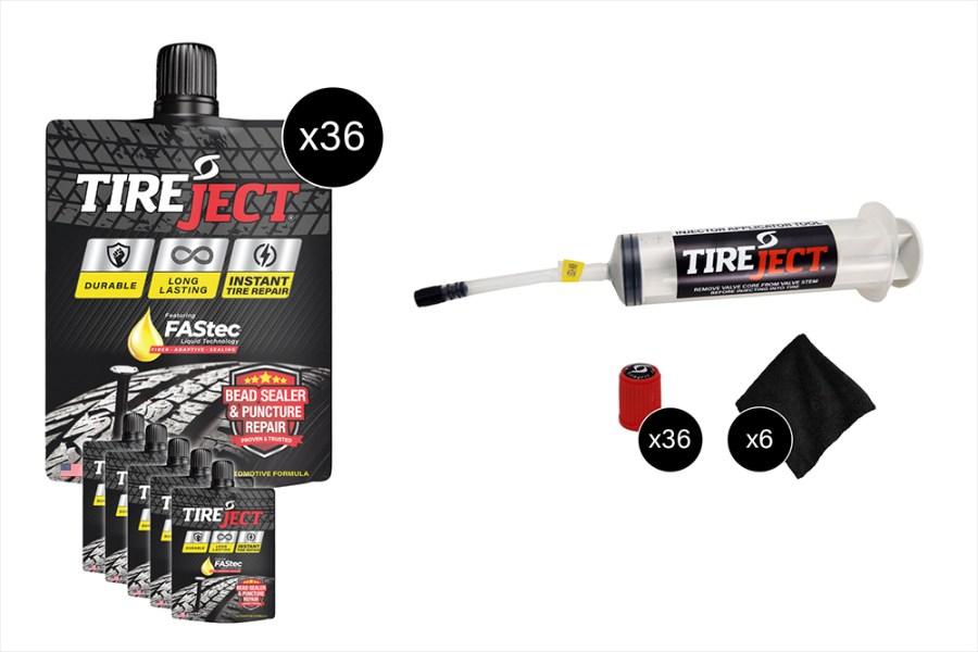 6x 6 pack pouches (36 total), Injector, Premium Valve Core Removal Tool, 6 replacement cores, 36 Red Valve Stem Caps, 6 Towels. Will fix up to 36 tires!