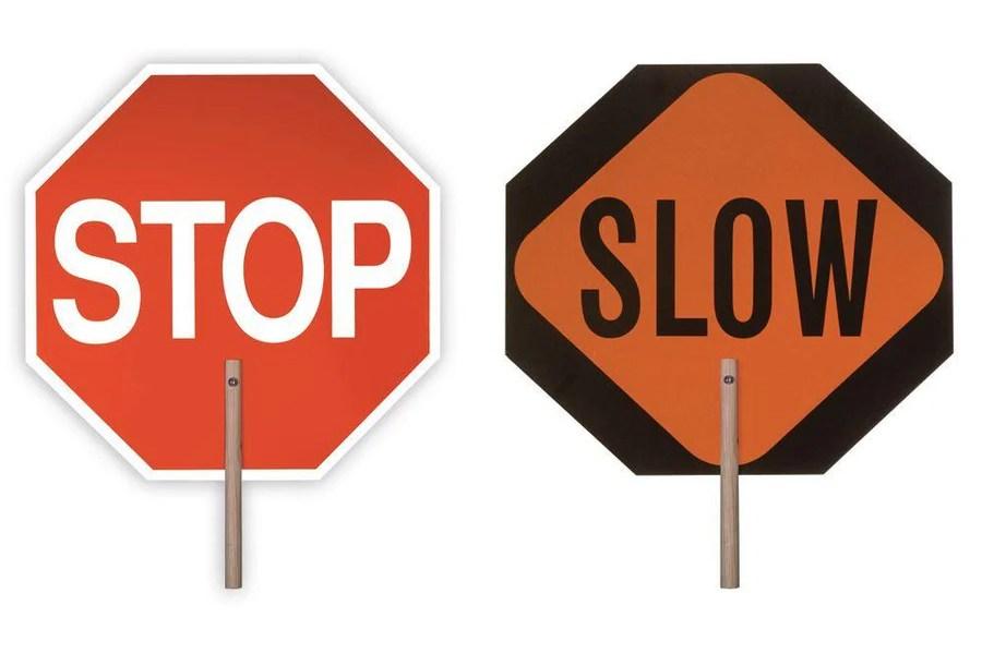 Two-sided paddle that has STOP on one side and SLOW on the other.