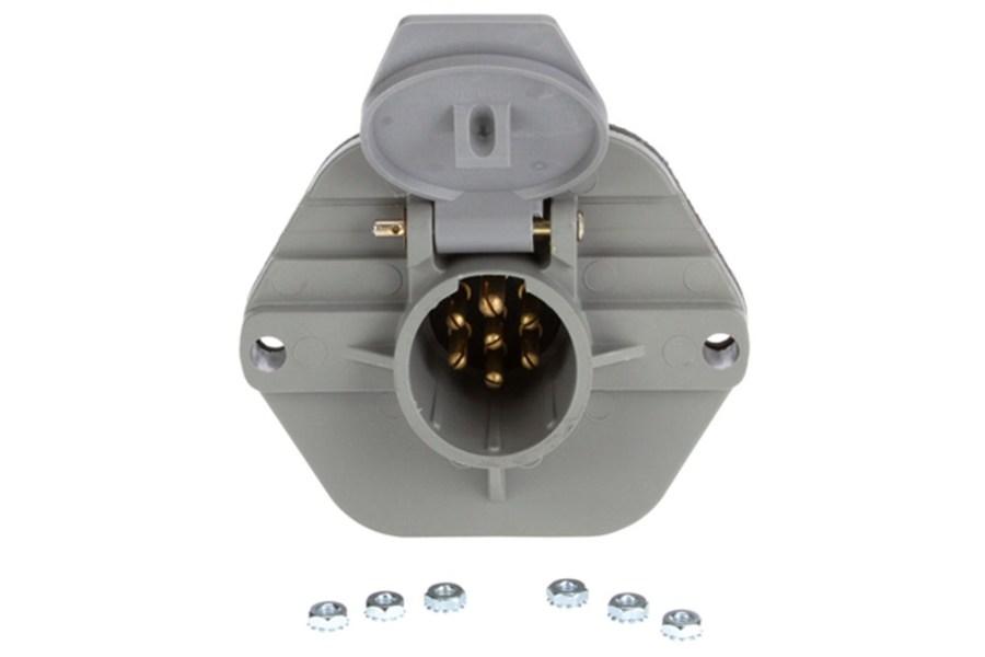 Tough GE Noryl, non-conductive, corrosion resistant body. Floating type, cadmium-plated brass pins allow best alignment and long-lasting contact with plug|Internal connections feature a direct wired ground. Circuits are identified by color codes and embossed notations. Ring terminals are used to connect wires|Receptacle pins prevent increased resistance due to strand breakage caused by set screws.