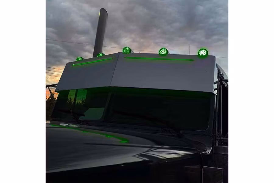 The TSUN-PETERBILT series sun visors are designed to fit Peterbilt models (1987+) with 2-piece glass windshields and cab-mounted mirrors. You are able to choose between a variety of different LED colors and an option of louvered spaces. It has an IP67 waterproof rating and is made from stainless steel protecting it from corrosion. It also includes a one-year warranty on the stainless steel and a three-year warranty on the LED