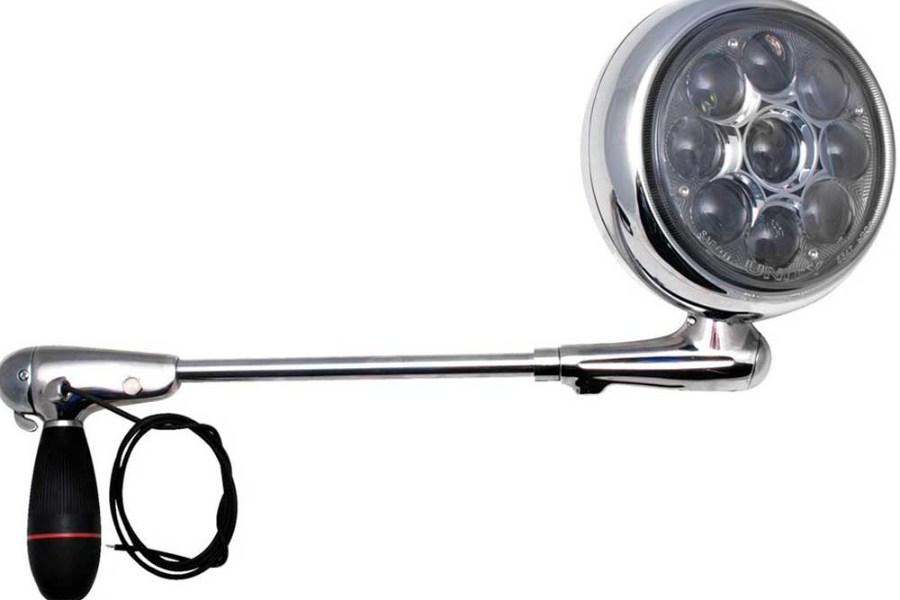 These spotlights mount with the head on the outside of the vehicle and handle inside for easy aiming. The 6" dia. lens with high impact PC/ABS plastic head rotates 360° and tilts 120°. A switch on the rubber grip handle turns the light on/off. Mounts through the post, door or cowl of your truck. LED produces 215,000-candlepower. 12V DC.