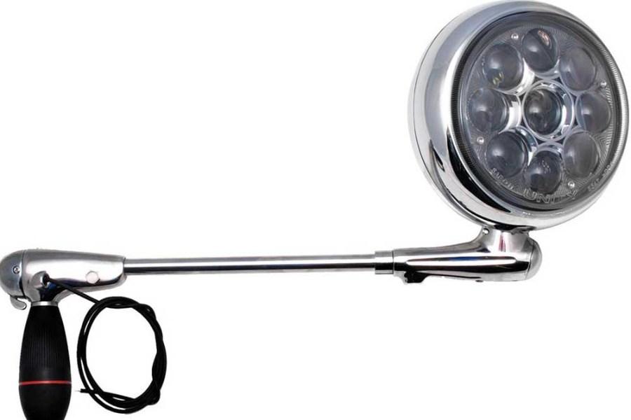 These spotlights mount with the head on the outside of the vehicle and handle inside for easy aiming. The 6" dia. lens with high impact PC/ABS plastic head rotates 360° and tilts 120°. A switch on the rubber grip handle turns the light on/off. Mounts through the post, door or cowl of your truck. LED produces 215,000-candlepower. 12V DC.