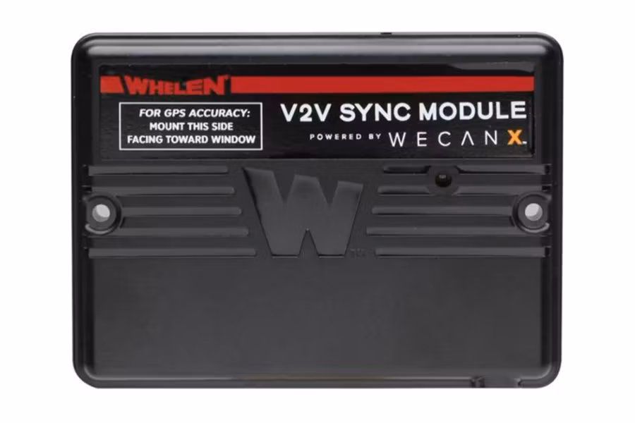 The Whelen WeCanX Vehicle-to-Vehicle Sync system automatically synchronizes lights and tones across multiple vehicles. For optimal performance, it is recommended to mount the module on the vehicle's dashboard or rear deck, though it can be installed on any flat surface or window. When mounting to a window, 3M SJ3560 Dual Lock tape is advised. The module must be positioned face-up, with the side displaying the logo oriented outward, as this side receives the signal. If mounted to a window, ensure the logo side faces outside the vehicle.