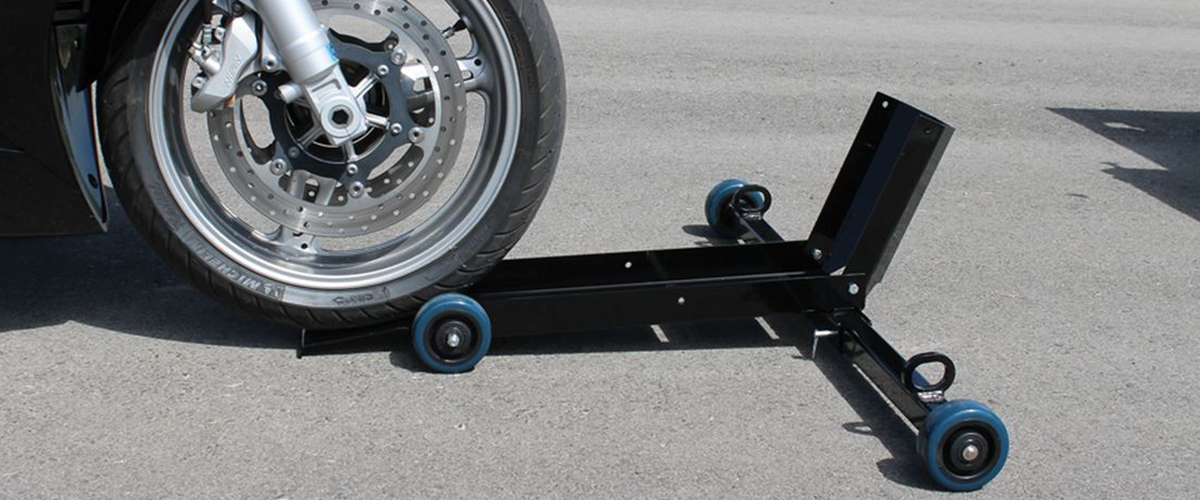 One equipment aide that could be helpful during the manual loading process is a front wheel chock. These metal brackets are permanently bolted to the surface of the car carrier or trailer deck and help keep the motorcycle upright during strapping and transport.