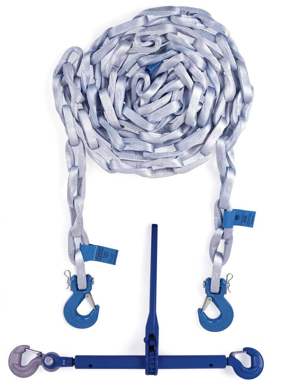 safety or performance. Tycan chains are 8x lighter and soft to the touch, making it effortless for one person to handle an entire chain. This chain has a 2 to 1 safety factor and it is not rated for overhead lifting. It is rated for lashing and load securement with a minimal breaking load of 44,800 lbs, lashing capacity of 22,400 lbs and standard tension force of 5,600 lbs.